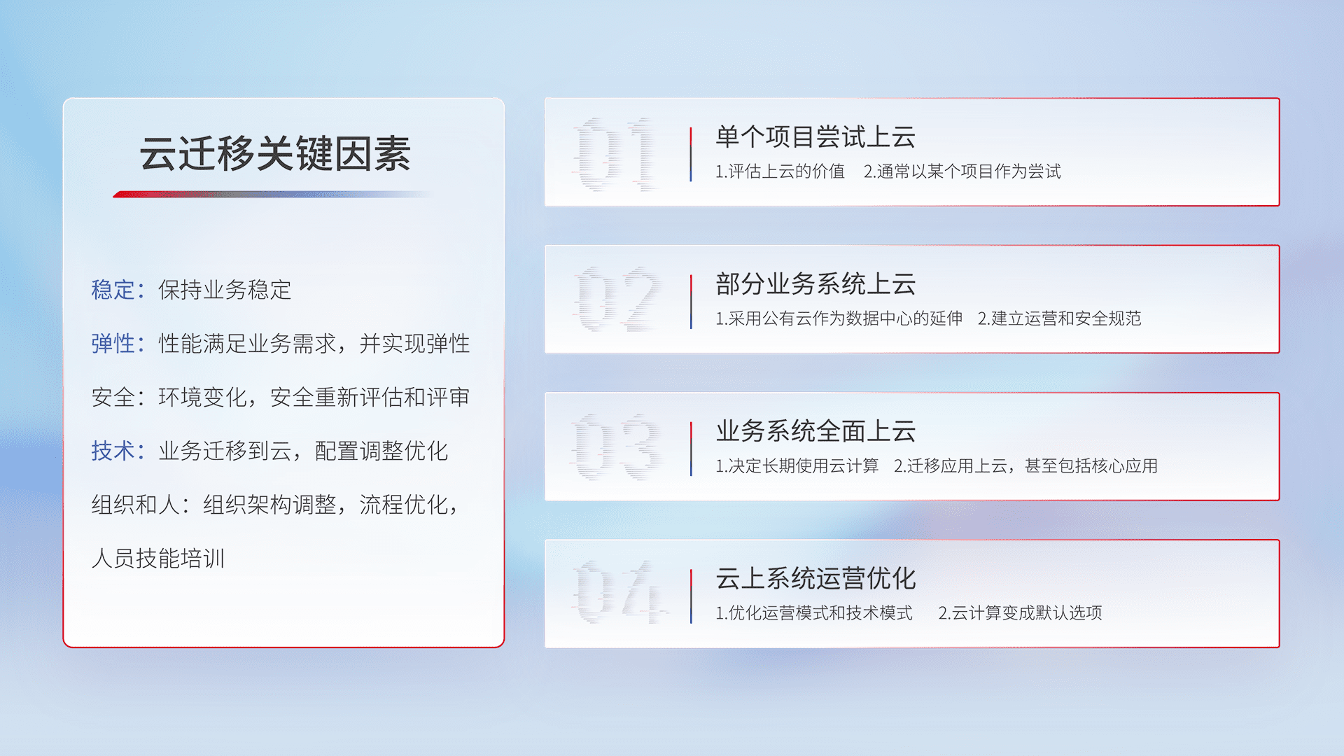 结合实际业务,,,从规划设计、、、、云平台选型、、云原生改造、、数据迁移、、、集成交付,,,,迁移全过程为客户识别最佳上云路径,,,做好风险识别管理,,,设计网络架构、、、身份权限、、安全审计合规、、、操作审计、、、日志审计、、、监控告警策略、、多站点容灾设计等,,,对云上基础设施进行整体规划,,提升IT治理水平,,,以满足弹性、、、高可用、、、、高性能的需求。。。