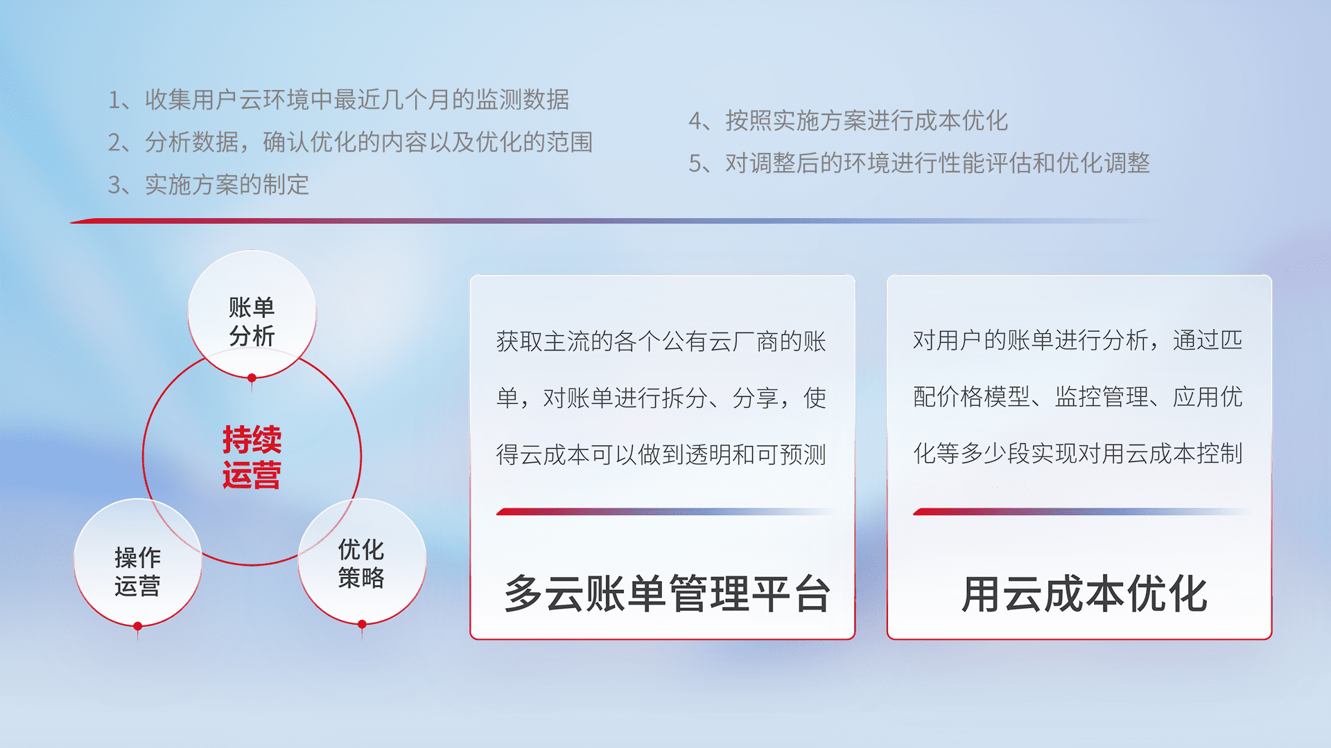 通过多云纳管,,,以统一的资源数据模型把客户的云资源进行抽象和封装,,,进而实现对多云资源的统一操作,,,保障云资源管理的可靠性、、、稳定性与可用性。。。。量身定制化运维内容,,,,配置、、开发运维、、、、补丁管理、、、备份、、、、监控、、、认证和访问管理、、、审计和日常巡检等,,,保障在用云过程中的可靠度,,稳定度以及高可用率。。。