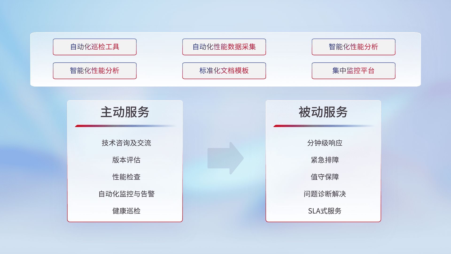 智能化工具和标准化文档,,,,保障服务质量,,,,提供主动服务(包含技术咨询、、版本评估、、、、性能检查、、、自动化监控与告警、、健康巡检)和被动服务包含(分钟级响应、、紧急排障、、、、值守保障、、、、问题诊断解决、、、SLA服务)。。