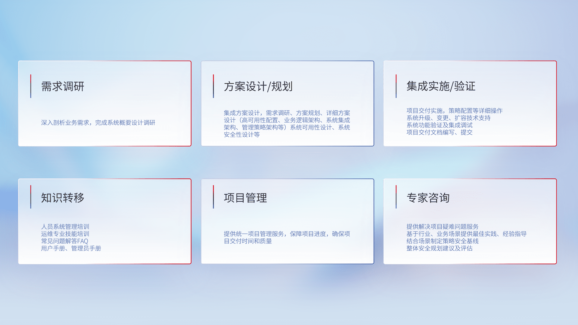 针对客户行业特性,,,将宏观的安全战略和需求,,,通过专业的交付服务,,,实现项目落地,,,,为客户提供标准规范的集成交付服务。。。